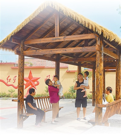王庄村村民在茅草亭内乘凉。